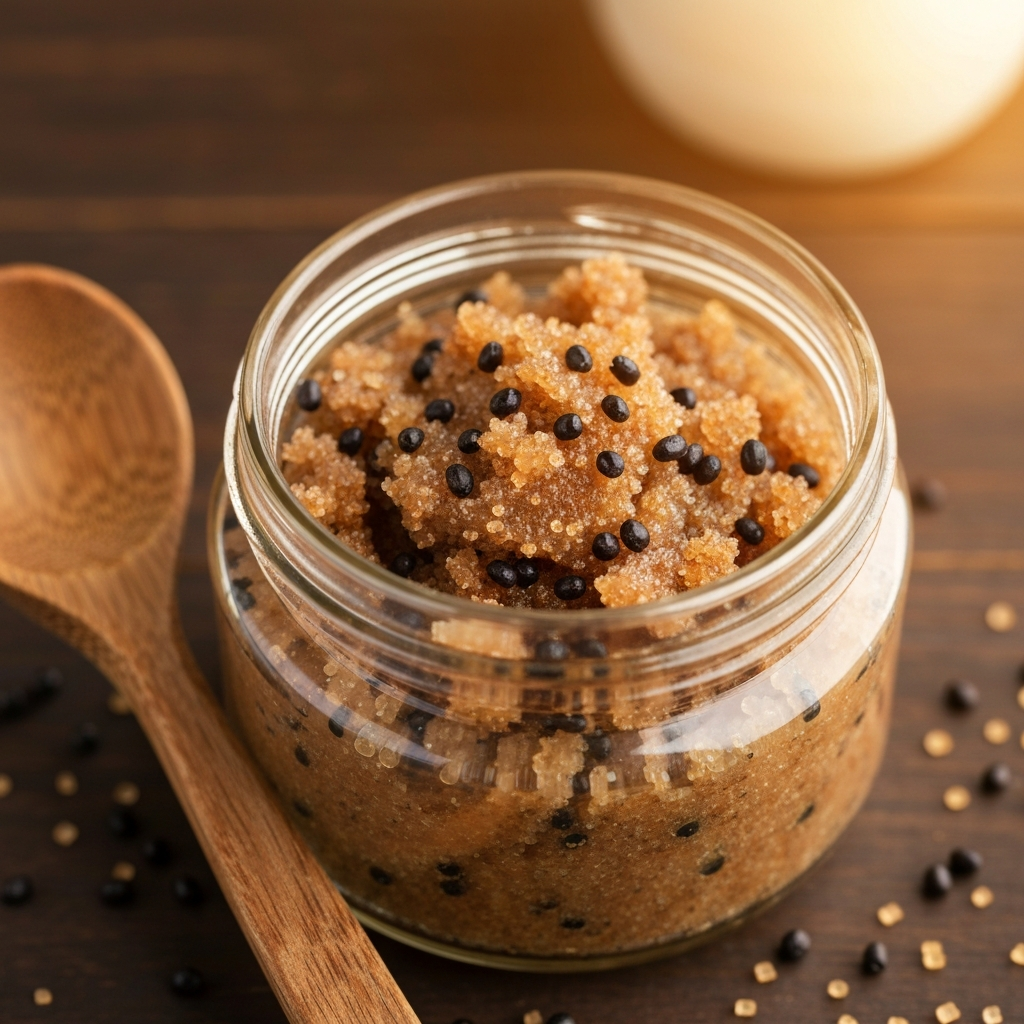 - La base exfoliante : Le sucre de canne (roux ou complet) est idéal car ses grains fondent doucement au contact de l’eau, offrant une exfoliation respectueuse de l’épiderme. Pour un gommage plus « tonique » (idéal pour les jambes), vous pouvez opter pour du sel marin fin.